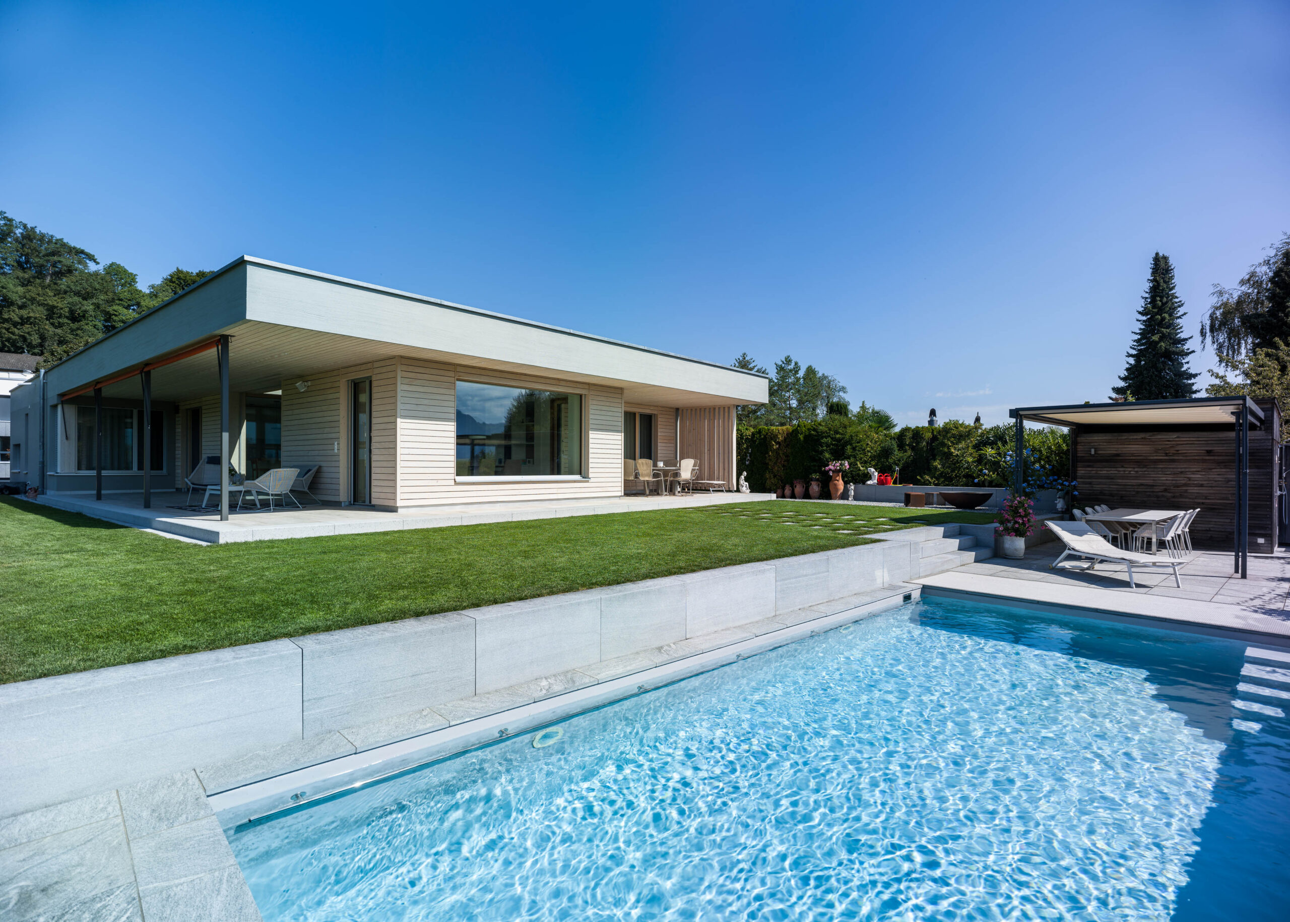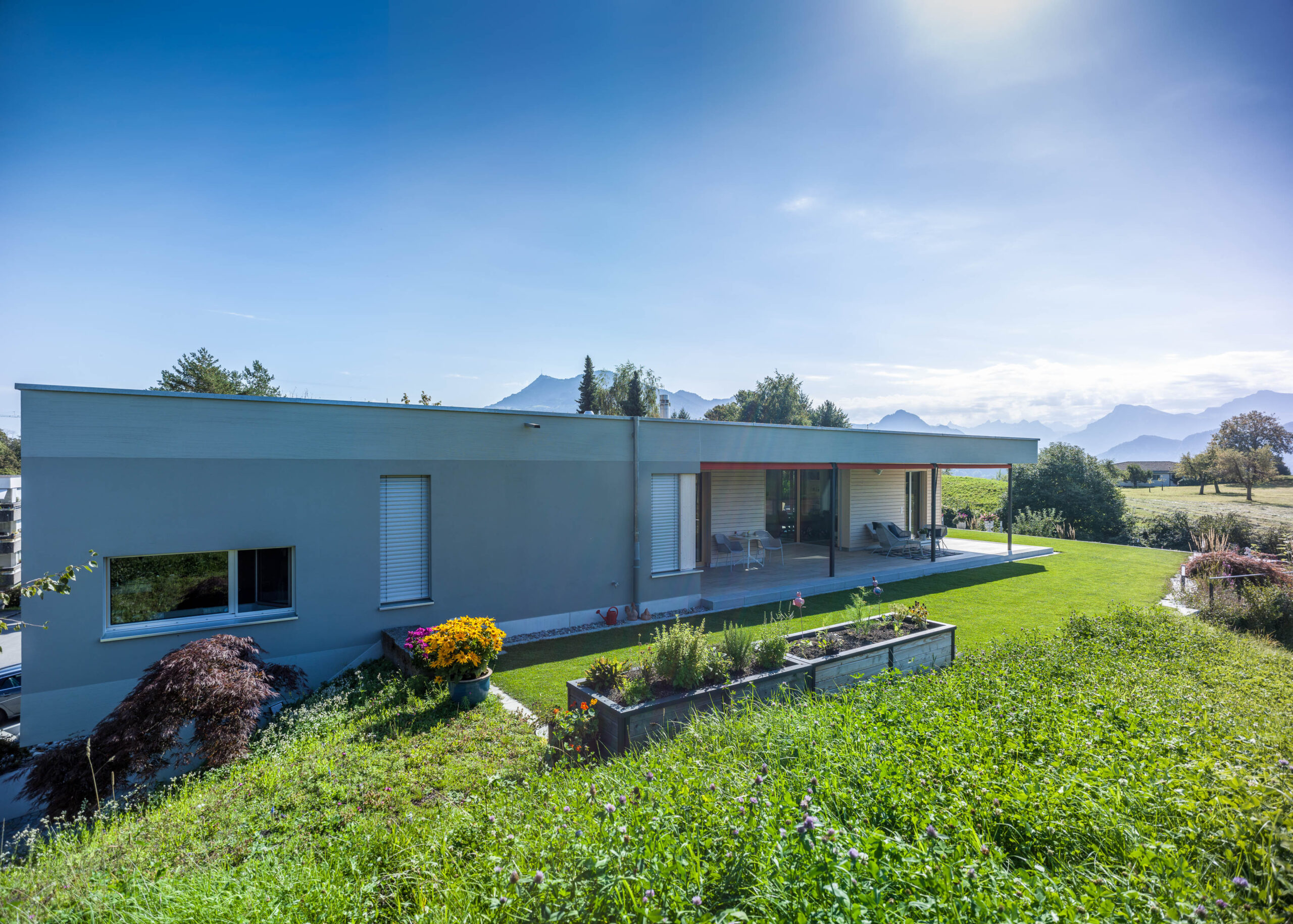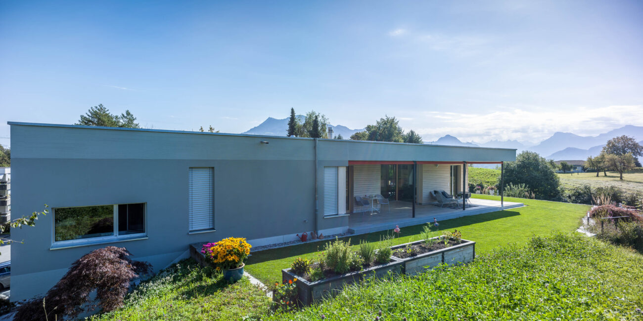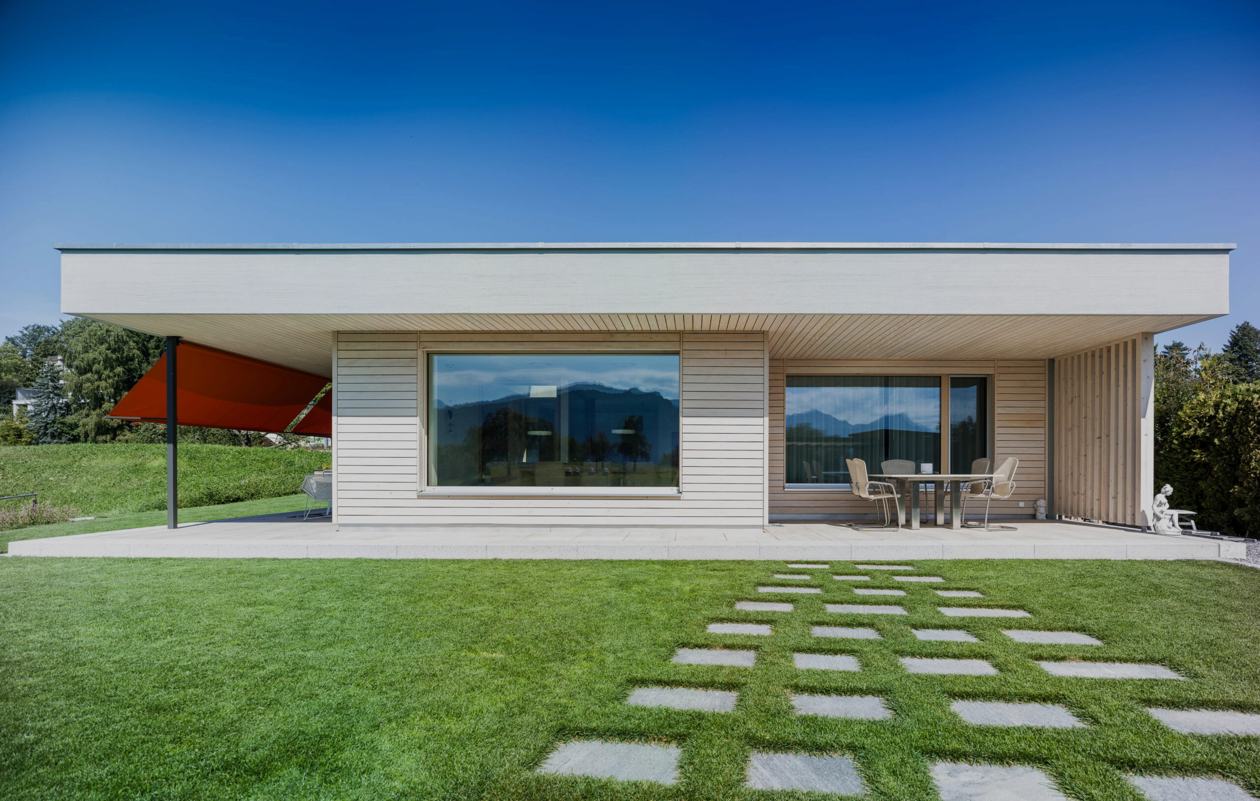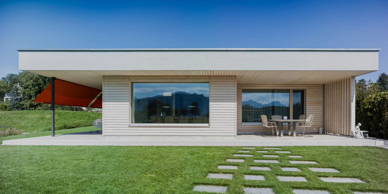 Eingeschossiges Einfamilienhaus als Holzkonstruktion auf betoniertem Sockelgeschoss