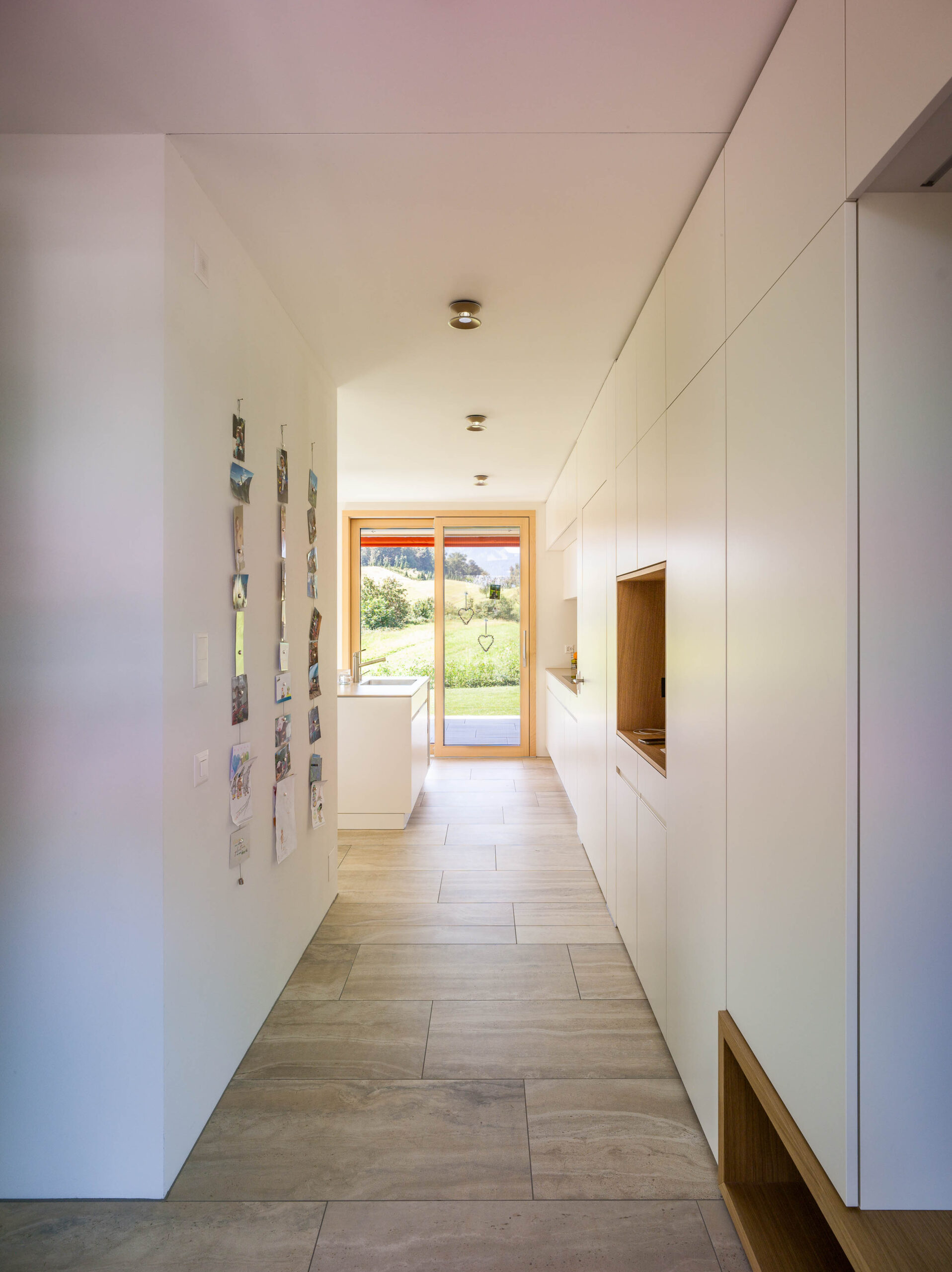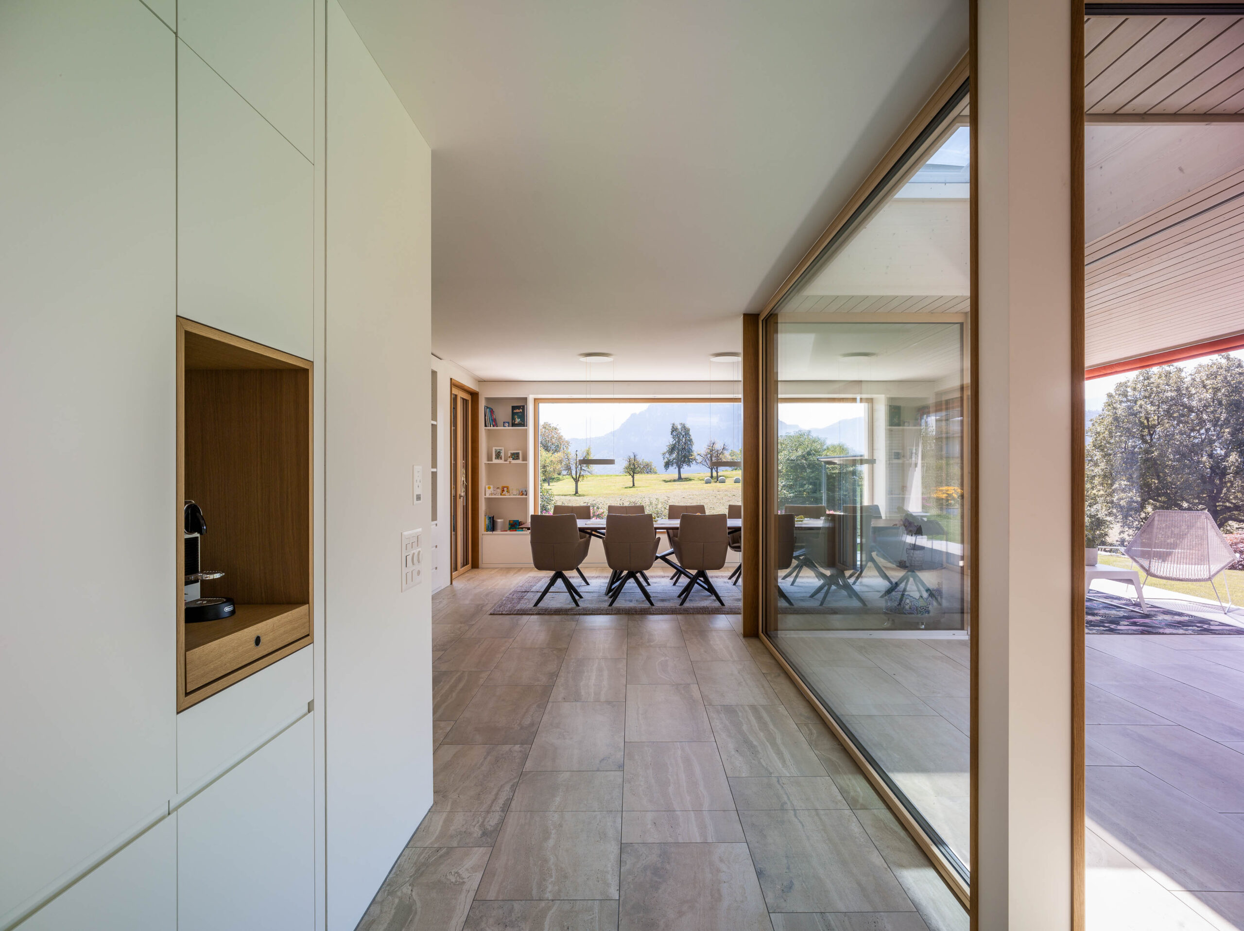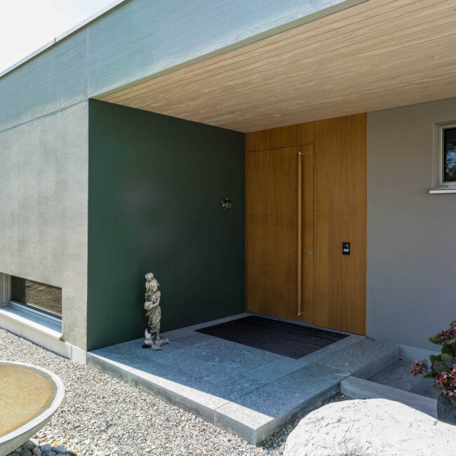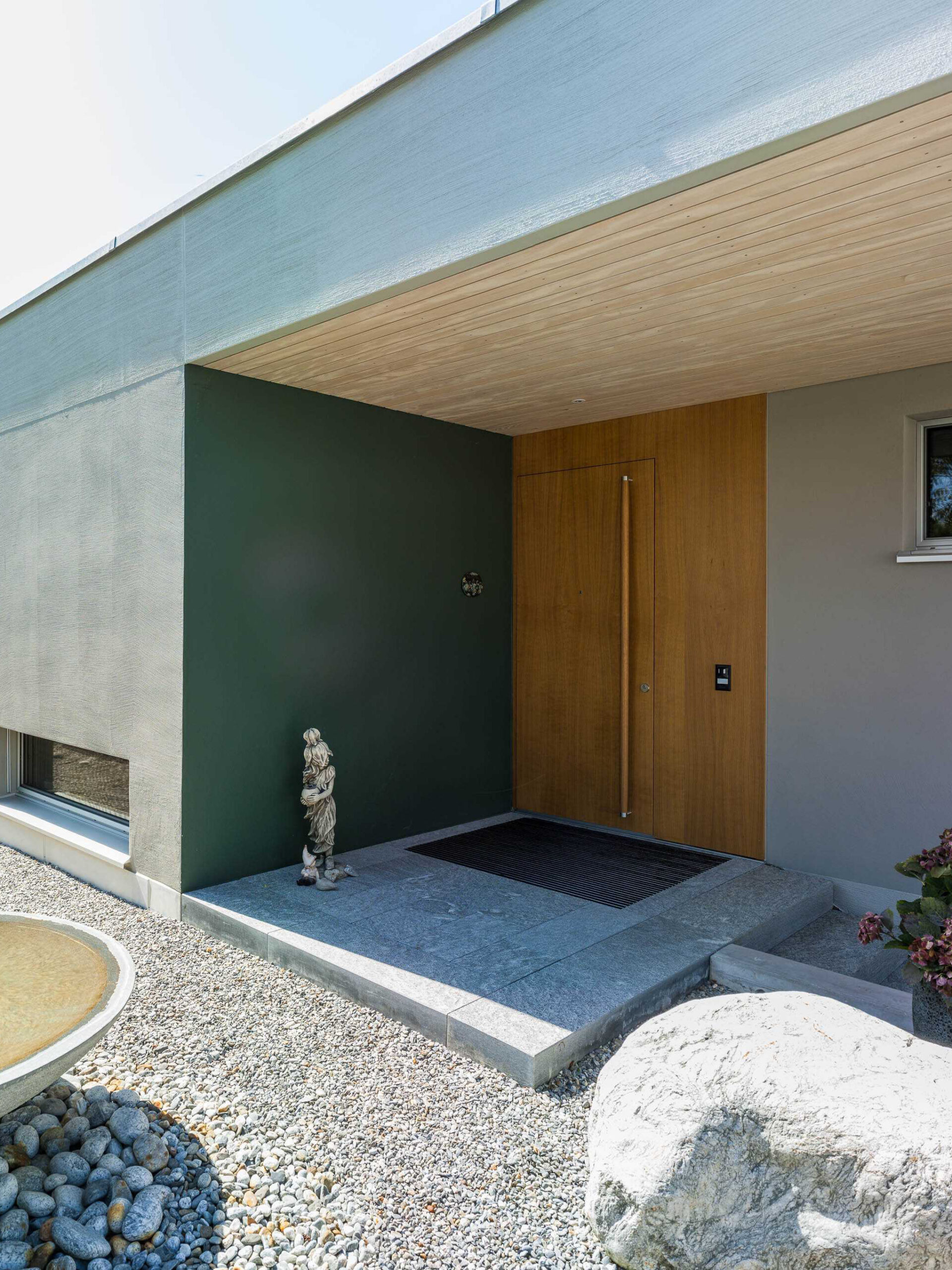 Diesen beiden «Gesichtern» des Volumens entspricht auch die Oberflächenmaterialisierung. Einerseits Putzflächen, andererseits eine Holzschalung für die privateren Bereiche, geschützt unter einem ausladenden Vordach.