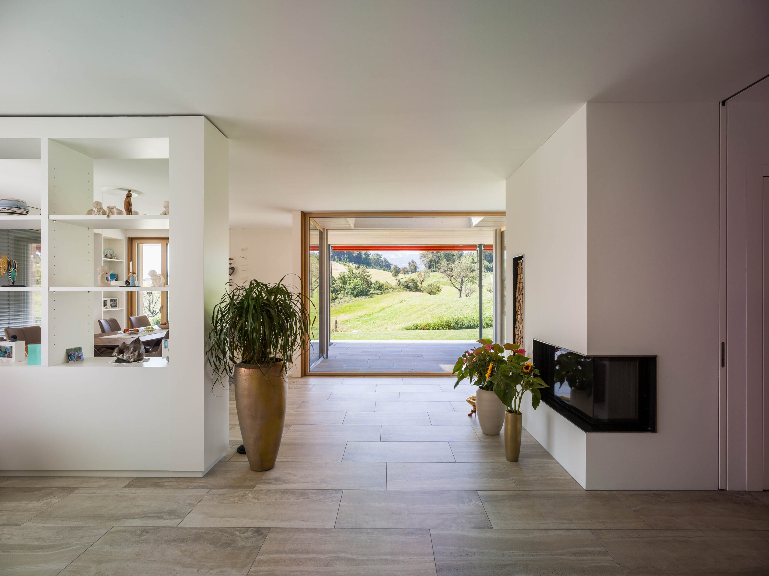 Auf Grund der einschränkenden Höhenvorgaben des bestehenden Gestaltungsplanes wurde ein langgestrecktes, flaches Volumen entwickelt. Dieses öffnet sich mit einer überdeckten und aufgelockerten Fassadenabwicklung zur Sonne und Garten. Auf diese Weise wird ein vielfältig nutzbarer und geschützter Zwischenbereich als Übergang von Innen zu Aussen geschaffen. Strassenseitig und zum Quartier bleibt es eher flächig und geschlossener.